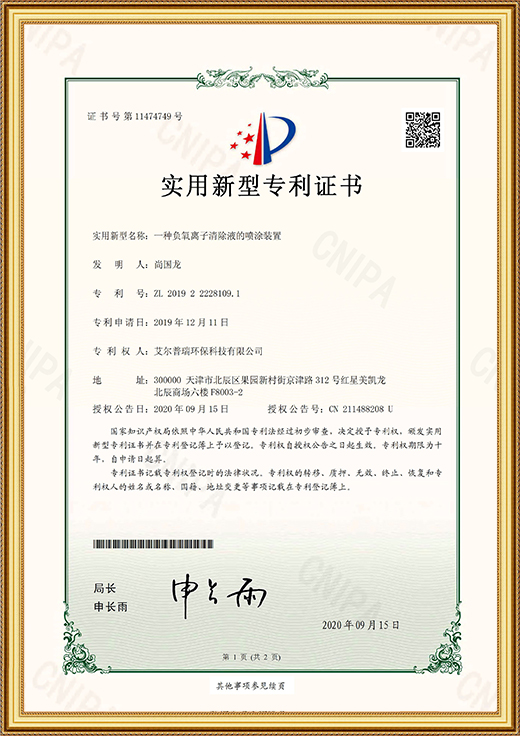 實用新型專利證書(一種負氧離子清除液的噴涂