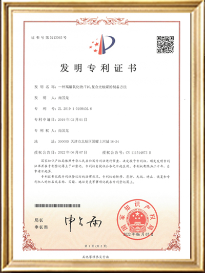 發(fā)明專利證書證書(一種高稿氧化物/Ti02復合光觸